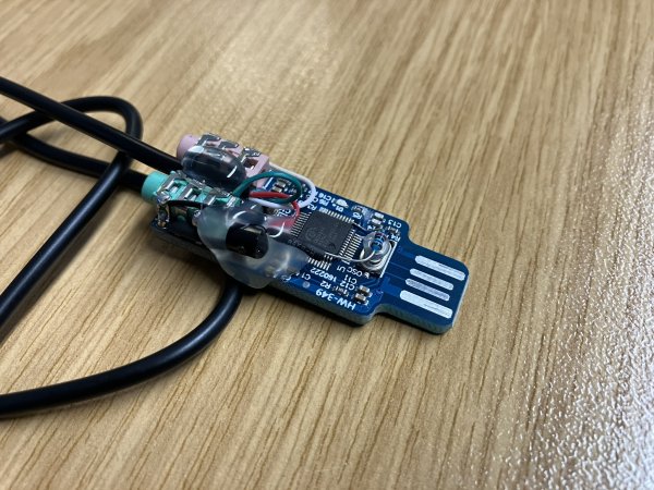 Hier eine modifizierte CM108 Soundkarte -- PTT-Schaltung mit Transistor und Wiederstand, vergossen mit Heißkleber.