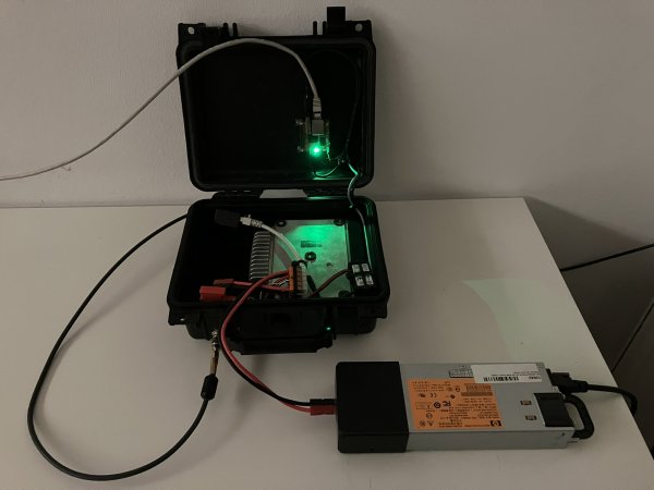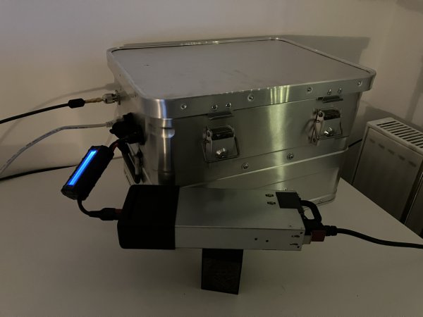Und umgezogen in einen kleinen 19" Koffer, der Uplink ist mittlerweile auf Hamnet umgestellt. Oben sind noch 4 SDR-Empfänger dazu gekommen, einer kümmert sich um ADSB, einer um Flarm und die anderen beiden hängen via Opensdr im Hamnet. Die gesamte Station wird über 12V versorgt und die sind gepuffert -- reicht ne Weile.